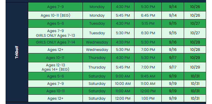 **PLEASE NOTE** First Tee Programs typically run from 4:00 PM – 7:00 PM Monday-Thursday and from 9:00 AM – 1:00 PM on Saturdays. During these times, we anticipate TriGolf will be busier than normal and the last 5 range bays will be dedicated to programming as well as the top portion of the putting green. Thank you for your support of First Tee — Triangle and youth golf!